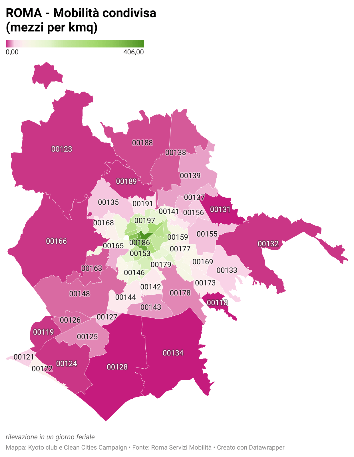 Per Roma sono stati analizzati 72 CAP, costruendo indicatori normalizzati (0–100) su quattro dimensioni: trasporto pubblico, ciclabilità e pedonalità, motorizzazione privata, reddito e densità abitativa. I dati mostrano una polarizzazione netta: aree centrali con indici elevati di mobilità sostenibile e periferie dove il punteggio scende sotto 35.